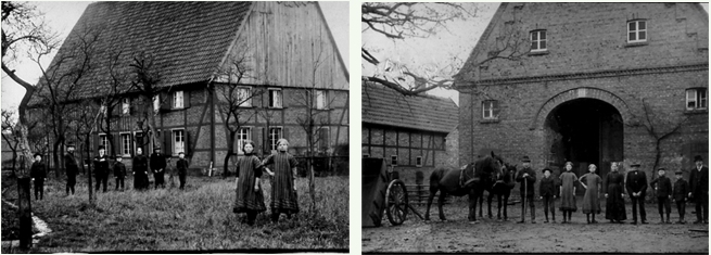 Das typisch westfälische 4-Ständerhaus, so wie es heute noch steht, wurde 1805 in den Grundzügen erbaut. Eine Balkeninschrift über dem mittleren Fenster auf der Nordseite des Hauses weist auf das Jahr der Errichtung hin. 1872 bekam das Haus sein heutiges Aussehen mit Ziegel-Gefachen und einer Ziegeleindeckung. Die Bilder zeigen das Haus und die Familie um 1916, aufgenommen einmal von der Hofseite und einmal von der Gartenseite. |